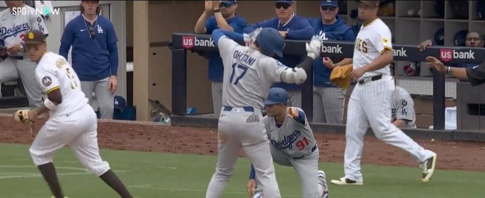 ドジャースの大谷翔平投手はパドレス戦に「1番・DH」で先発出場。第5打席でダメ押し点の口火を切るスリーベースヒットを放ったが、三塁到達時に足首を痛めたようなしぐさを見せたことで騒然となった。