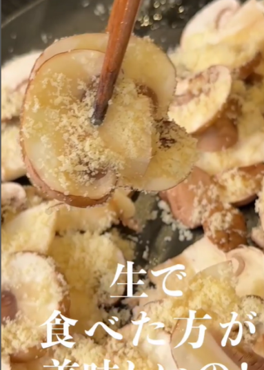 どうやらマッシュルームを使ってレシピを紹介しているようだ。切って、塩・オリーブオイル・粉チーズをかけるだけという究極に簡単な料理だ。生で食べるマッシュルームは一体どんな味がするのか気になるところだ。