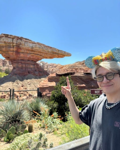 抜けるような青空の下、カーズの岩山を背景に、にこやかにポーズを決める岸優太。頭には「Disneyland」と書かれたカチューシャがちょこんとのっていて、そのギャップに思わず笑ってしまう。照れ隠しなのか、はにかんだ表情がなんとも彼らしい。「こんちわす!!!」という元気な挨拶も、暑さを吹き飛ばすくらいの勢いで届いてくる。非日常のテーマパークでも、彼の素朴な空気感は変わらない。この投稿は癒しと元気、両方もらえる。