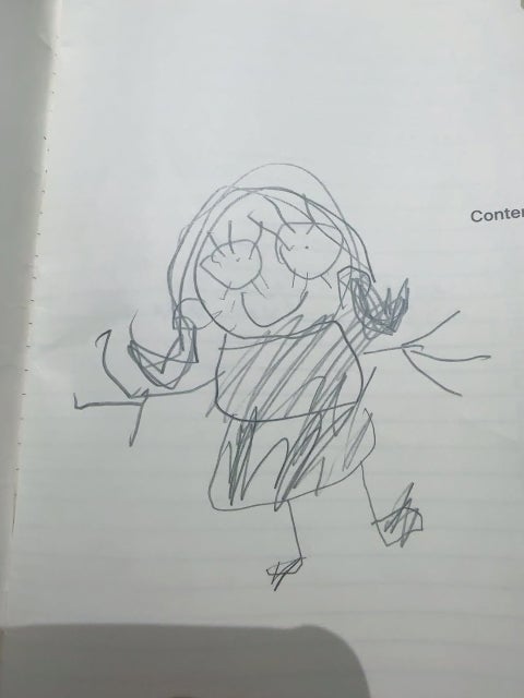 続けて「どの絵がだれかわかるかな?一枚目は美人ちゃんみたいです。」と綴り、投稿を締めくくった。素朴な線の中にあふれる生命力がまぶしい。お子さんの描いたこの絵は、顔いっぱいのまんまるな目とニッコリ笑顔が印象的で、見るだけで自然と笑顔になる。左右に広がる腕やバランスの取れた脚も、自由でのびのびしていて、大人では真似できない純粋なエネルギーを感じさせる。