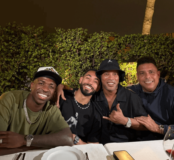 この投稿には「Resenha boa!!!(最高に盛り上がった時間だ!!!)」と綴られ、現ブラジル代表10番でレアル・マドリード所属のヴィニシウス・ジュニオール(24)、マンチェスター・ユナイテッド所属のマテウス・クーニャ(26)、そして日韓W杯で得点王に輝いたロナウド・ナザーリオ(48)との豪華な4ショットが公開された。