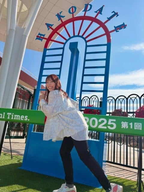 テレビ北海道アナウンサー・中村秋季乃 函館競馬場での晴天到着リポート | 話題の投稿