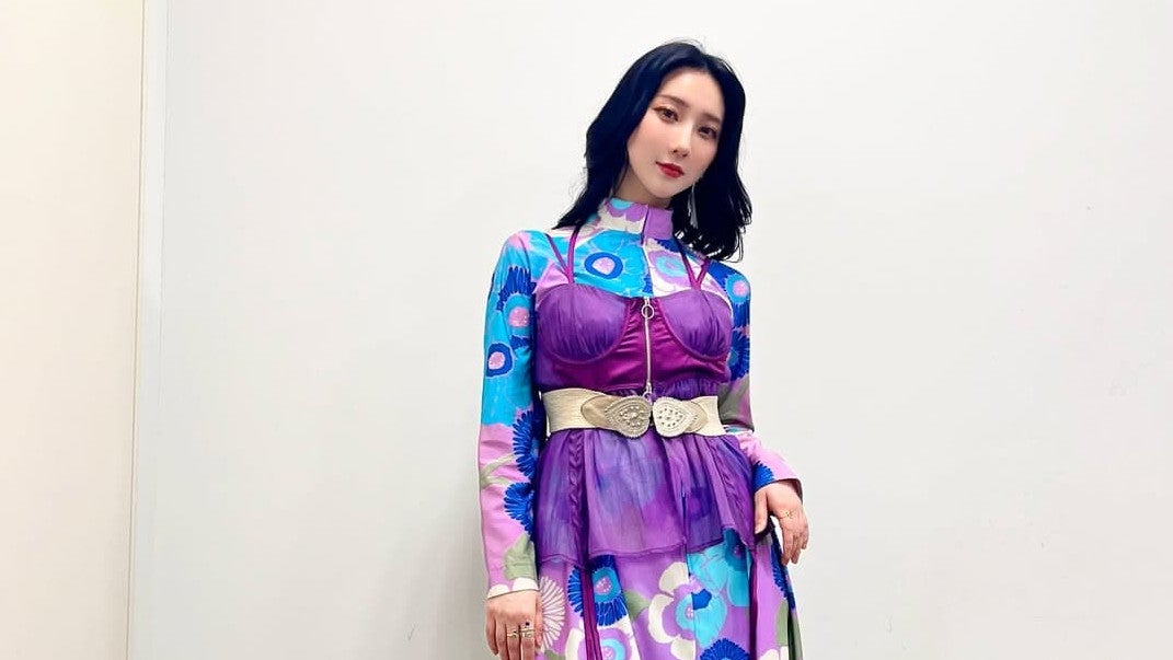 この日は”human vintage”のワンピースに、小物はベルト・イヤリング・リングを合わせたとのこと。ワンピースには大柄の花が描かれており、梅雨の憂鬱さも吹き飛ばしてくれるような色鮮やかな衣装だ。