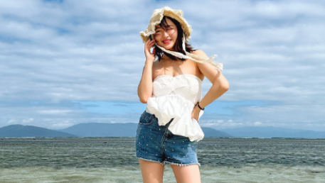 美しく澄んだ海の浅瀬で、楽しそうな笑顔を見せる田島が可愛いと話題になっている。
