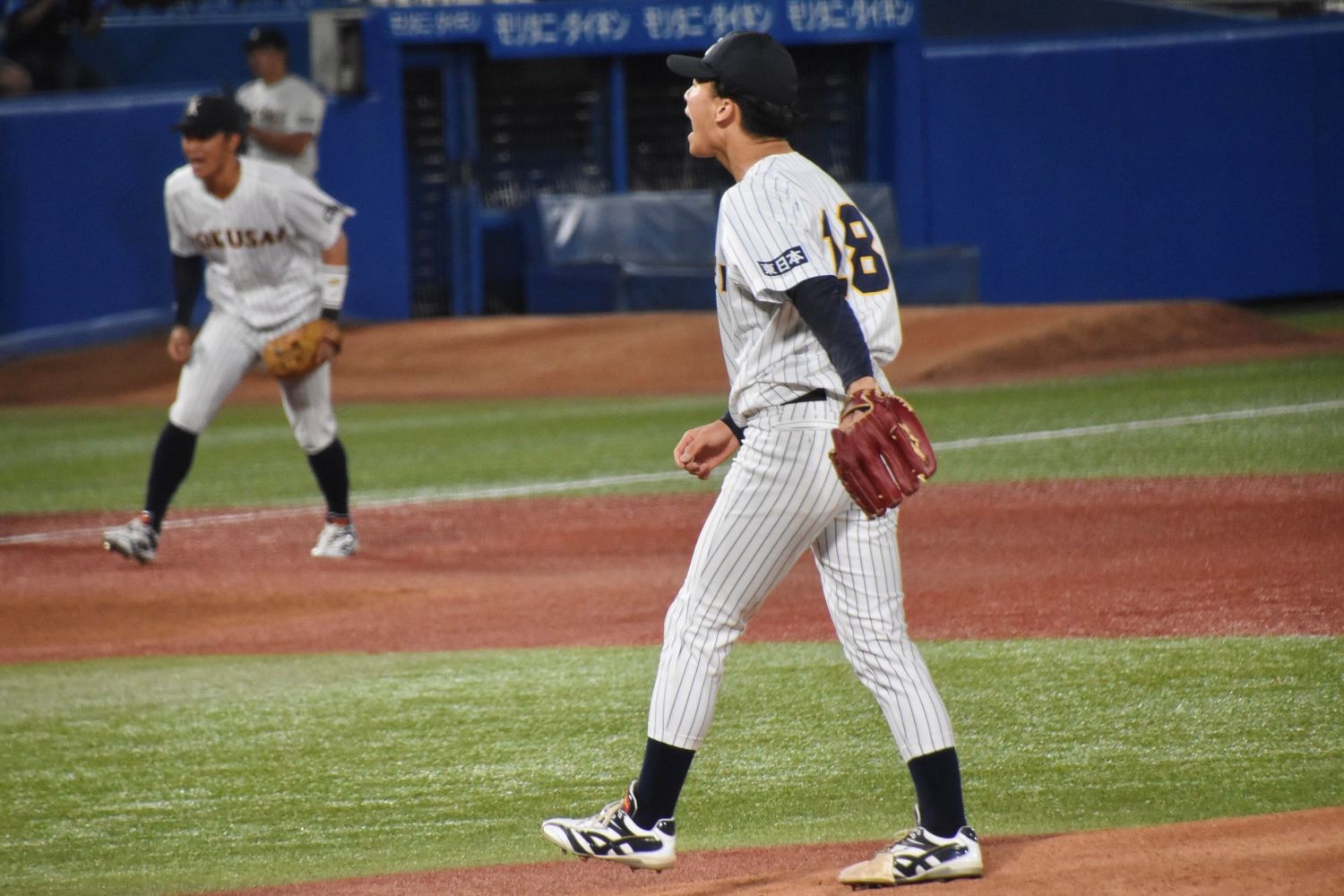 東北福祉大戦の初回、先頭打者に安打を許し、いきなり1死二塁のピンチを迎える。ここで3番・佐藤悠太(3年=報徳学園)、4番・冨田隼吾(4年=花咲徳栄)の強打者2人を連続三振に仕留め、雄叫びを上げた。自身が課題として挙げていた立ち上がりを無失点。幸先の良いスタートを切った。