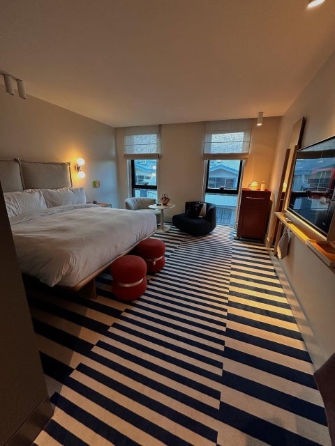 続けて「Wall artがたくさん見れるRoseストリートにあって、ホテル自体もアート。入り口の真っ赤のドアからロビー、置いてある家具やお部屋も、ケトルでさえもこだわりがあって可愛い。ルーフトップからは朝日も見れる。毎回ここに帰ってくる度にテンション上がりました。」と綴り、投稿を締めくくった。幾何学模様のカーペットに導かれるように広がる空間は、まるでギャラリーの一室のような趣だ。彼女が滞在したこのホテルはアートとデザインが調和した非日常の空間で、ベッドや家具、照明に至るまでこだわり抜かれた美意識が感じられる。窓から差し込む柔らかな光と整然と配置されたインテリアが、落ち着きと高揚感を同時に与えてくれている。