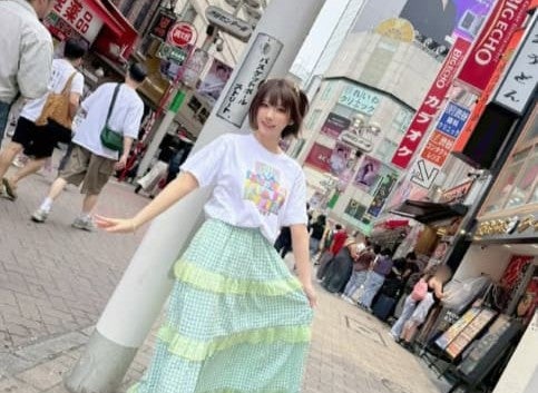 「渋谷で勇次郎Tシャツ着てる人。この日のために買ったスカートがめちゃくちゃ可愛すぎた」と綴り1枚の写真を投稿。刃牙のTシャツとグリーンの春らしいスカートを合わせた渋谷でのオフショットを投稿した。この日のために買ったスカートがお気に入りだという。