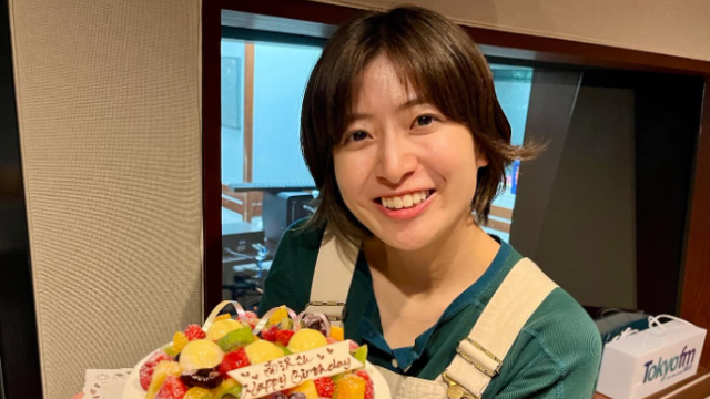 フルーツ盛りだくさんの美味しそうな誕生日ケーキをかかげ、にっこりスマイルの南沢にファンの注目が集まっている。