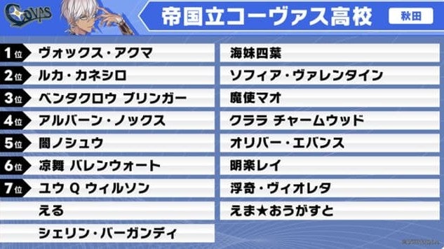 投稿では、自らが理想とする“夢のクラス名簿”として、「帝国立コーヴァス高校 秋田校」の座席表を公開。ヴォックス・アクマ、ルカ・カネシロ、アルバーン・ノックスなど、にじさんじENを中心としたメンバーが名を連ねている。