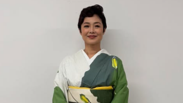 緑と白の爽やかな配色の大島紬をまとい、微笑む有働の姿にファンの注目が集まっている。