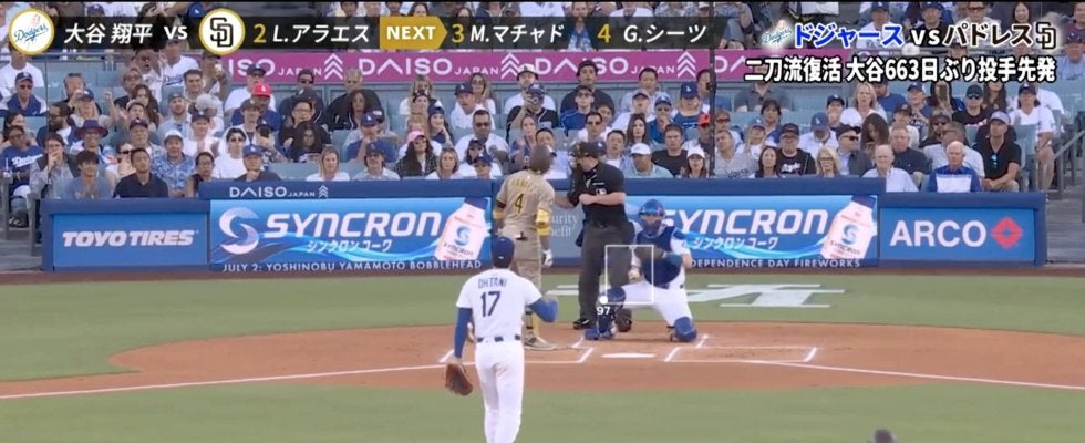 ドジャース移籍後では初めて投手として出場した大谷は、初回の先頭打者から自慢の球威で相手打者を押し込んでいく。その中でも注目を集めたのが、無死一塁で迎えたパドレスの2番アラエス内野手との対戦だ。