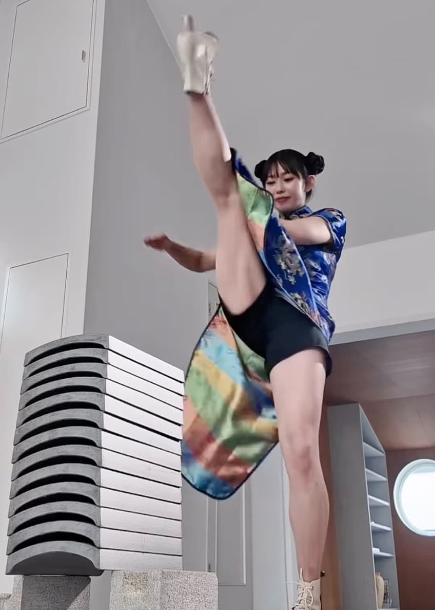 投稿には、派手なチャイナドレス風の羽織をまといながら、高く脚を振り上げてブロックに一撃を食らわせる瞬間の姿が収められている。表情は真剣そのものだが、衣装やポージングからは彼女らしいユーモアと華やかさも感じられ、視覚的なインパクトは抜群だ。投稿内では「最高記録のかかと落とし!?にも挑戦させていただきました〜!!」とコメントしており、その挑戦心に拍手が集まっている