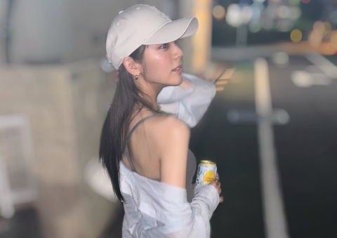 酒を片手に、シンプルでラフな服装で夜の街を歩く様子を公開した。美しい背中や肩もみせ、多くのファンを魅了しているようだ。