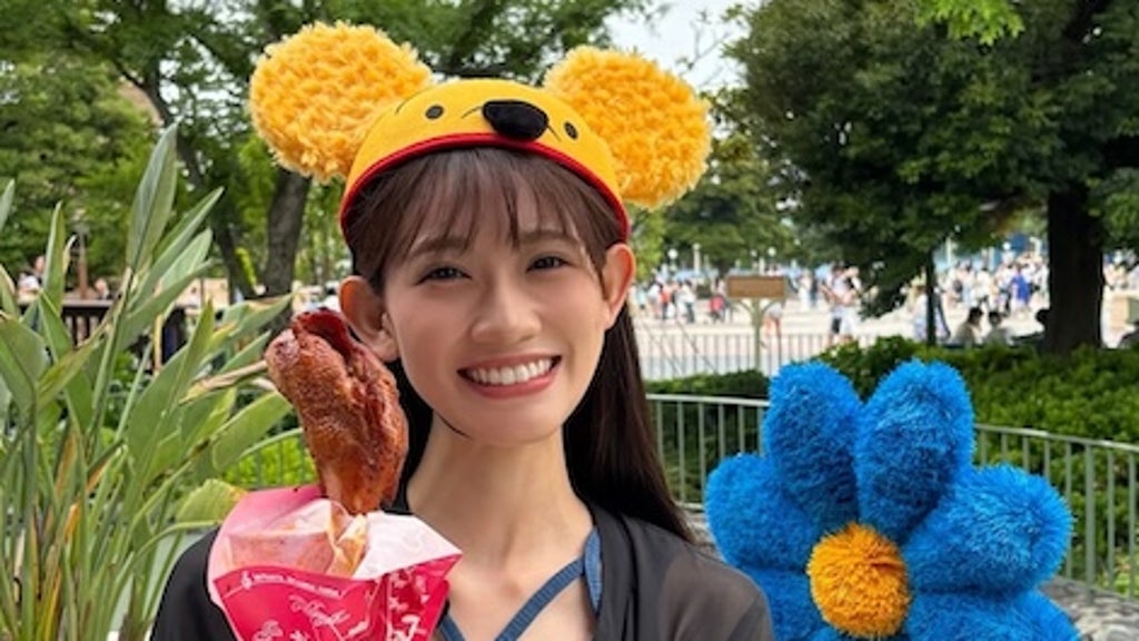 投稿された写真では、黄色いくまのプーさんのカチューシャを着用し、パーク名物のチキンレッグを手に笑顔でポーズを取る秋本の姿が確認できる。デニムのサロペットに黒いカーディガンを合わせたカジュアルな装いで、園内の緑豊かな景色を背景にリラックスした表情を見せている。