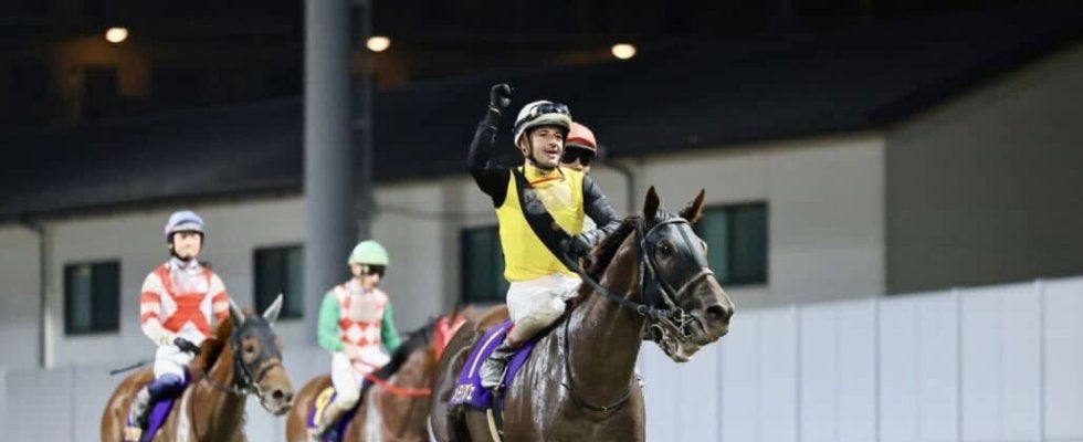 「3コーナーから馬の手応えはとても良かったですから、だんだん加速してくれましたし、早めに抜けましたね。馬の状態はバッチリでしたね。やっぱりナイター競馬は初めてでしたけど、全然関係なかった。ずっと真面目だったし、息が入ったし、最後すごく良い脚を使ってくれました。5番手ぐらいで速いペースをフォローして、だんだんポジション上がってきました。向正面からずっと自分で進んでいきましたので、僕はただのパッセンジャーでした。JRAで2連勝しました。両方いい感じでしたから、今回も重賞レベルで能力を見せてくれました。これから重賞レベルでまた楽しみにしてます。(柄崎調教師の重賞初制覇)よかったですね。たくさん勝てると思いますね、これから。先生おめでとうございます!皆さん今日は競馬場に見に来てくれてほんとにありがとうございます。僕にとって川崎競馬場は結構ラッキー競馬場ですね。今日いい天気で皆さん競馬を楽しんだと思います。また今度応援してください。ありがとうございました」