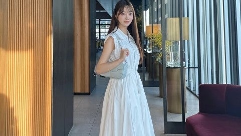 光が差し込むモダンな空間に、彼女の白ワンピースがふわりと浮かび上がる。ナチュラルなベージュのバッグとスニーカーが全体に柔らかな抜け感を与え、肩の力を抜いた品のあるカフェスタイルが完成されている。ガラスと木の調和が取れた空間の中で、彼女の存在は静かに、しかし確かに主役として輝いている。余計な言葉はいらない、そんな投稿となっている。