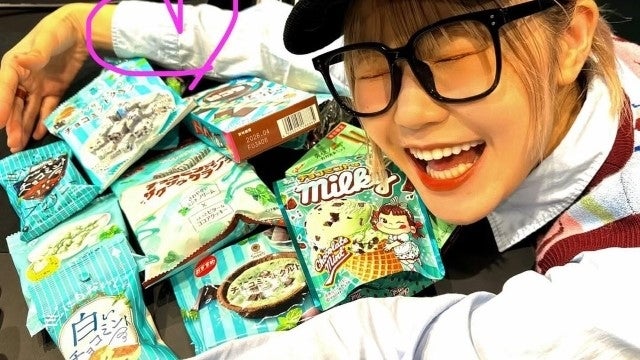 見ているだけで甘くスーッとした香りが漂ってきそうなチョコミントの山に、満面の笑顔で飛び込む彼女の表情はまさに“無条件の幸福”。黒縁メガネとキャップというカジュアルな装いも、この瞬間の無邪気さをより強調している。大好きなものに囲まれる喜びがダイレクトに伝わる、チョコミント愛が炸裂したエネルギッシュな1枚となっている。