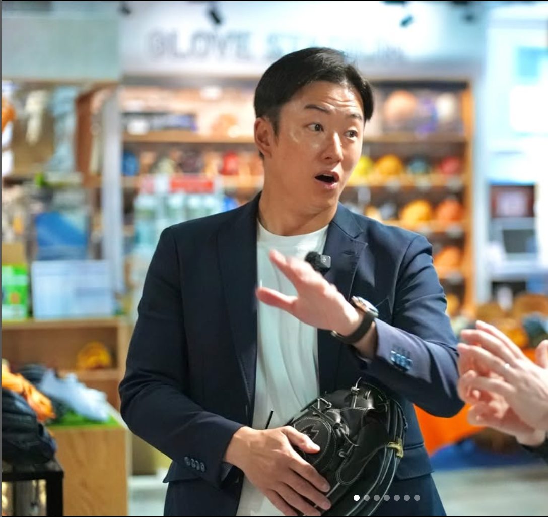 今回の投稿では、東京・丸の内にあるMIZUNO TOKYOを訪れ、野球をする子どもたちにプレゼントするための道具選びに臨んだ様子が収められている。