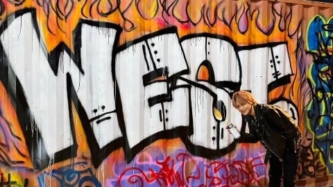 鋭く燃えるグラフィティの中に刻まれた「WEST」の文字が、仲間と情熱の象徴として夜の闇に鮮烈な印象を刻みつける。コンテナをキャンバスに見立て、全力で表現されたストリートの魂に彼の誇りが重なる。