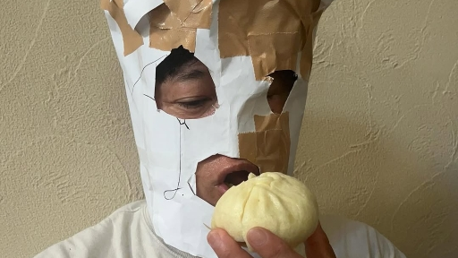 お子さんが作ってくれたという覆面をかぶり、肉まんのようなものにかじりつくスギちゃんの姿にファンの注目が集まっている。