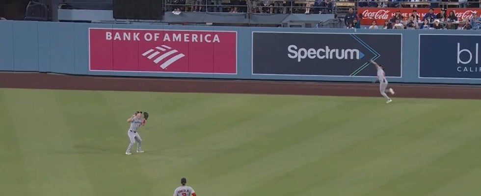 同時にセカンドのガルシアは、「後ろ! 後ろ!」とばかりに指をさすと、落下してきたボールはヤングのはるか後方にあり、ライトのリレ外野数がフェンス手前で捕球。この日のドジャースタジアムは薄暮のように暗く、ヤングの見当違いの珍プレーとなった。