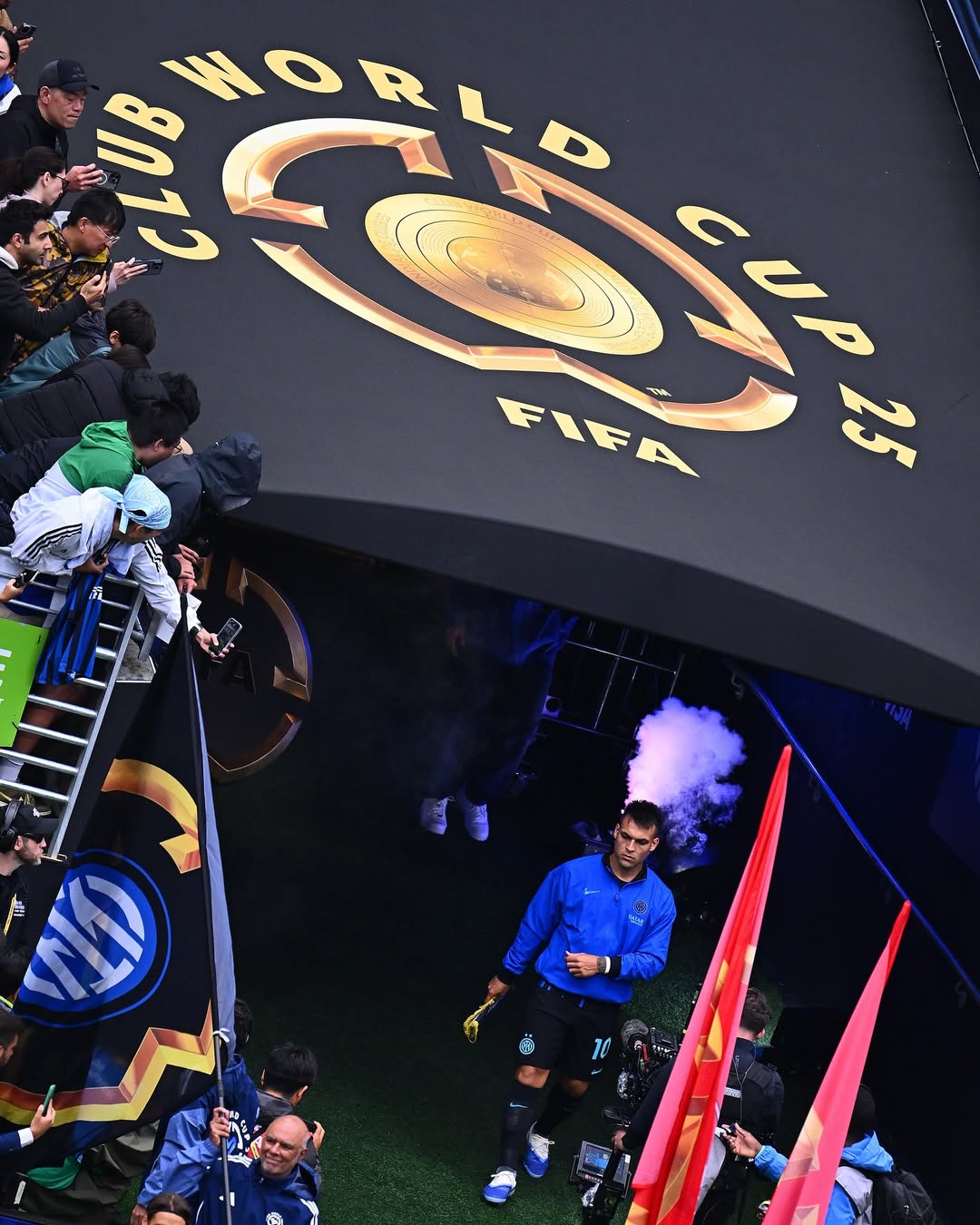 画像には、ラウタロ・マルティネスがインテルのジャージを着てトンネルから入場する様子が映し出され、頭上には「CLUB WORLD CUP 25」の金色のロゴが燦然と輝く。煙が立ち上る演出の中、選手の真剣な表情とサポーターの熱気が交差する瞬間が捉えられている。まるで映画のようなワンシーンに、多くのファンが目を奪われるこの1枚は高まる緊張と期待がひしひしと伝わる。