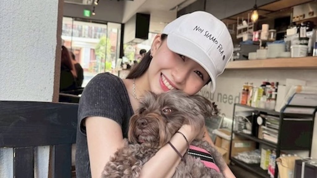 写真には、茶色い犬を抱きしめて微笑むCocomiが写っている。