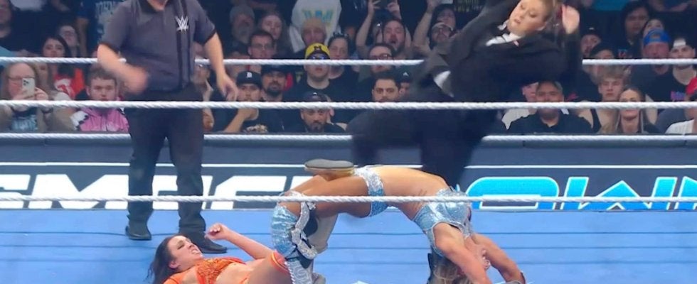 そんなパイパーがシャーロット・フレアとチェルシーとの一騎打ちに介入。シャーロットが必殺技の「フィギュア8」を決めるとチェルシーはすかさずタップで降参。しかし、その直後にパイパーが遅れてセントーンを見舞った。膝がぐにゃりと曲がったように見えたこの攻撃で、古傷を抱えるシャーロットは悶絶していた。
