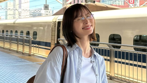 爽やかな水色コーデの私服をまとい、メガネをかけ気持ちよさそうなスマイルを見せる朝日が可愛すぎると話題になっている。