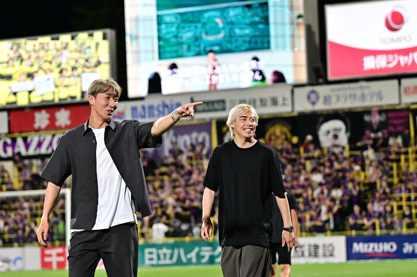 写真には、共に登場した伊東純也とともに、ファンに向けてピッチ上でリラックスした笑顔を見せる関根の姿が。観客席には黄色いユニフォームと横断幕が広がり、スタジアム全体が温かい歓迎ムードに包まれていた。