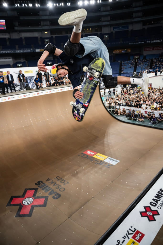「フロントサイド360 to フェイキー」を皮切りに、常に高いエアーを保ちながら「キックフリップステイルフィッシュグラブ」や「フロントサイドヒールフリップボディバリアル360」そして「インディグラブ720」を綺麗に決め切るフルメイクランで88.33ptをマーク。1本目のスコアをアップデートし順位をジャンプアップ。自身初のX Gamesメダルを銀メダルとした。