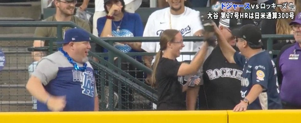 ドジャースの大谷翔平投手が「1番・DH」でスタメン出場し、6回の第4打席でレフト方向に2戦連発となる27号ホームランを放った。日米通算300号のメモリアルアーチを外野席で観戦していた女性がスーパーキャッチ。これには実況・解説陣も大興奮だった。