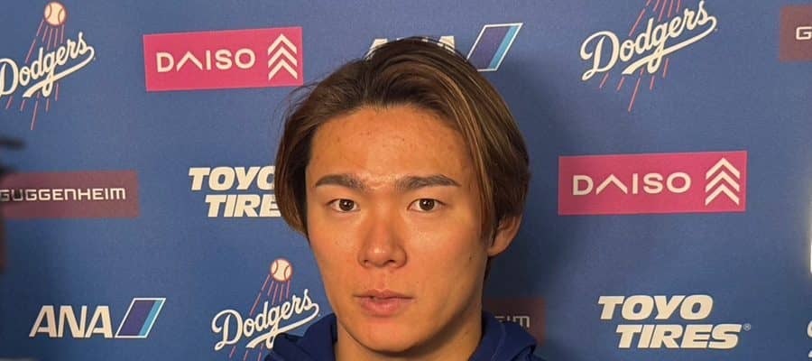 試合後の取材に応じたドジャース・山本由伸【写真:上野明洸】