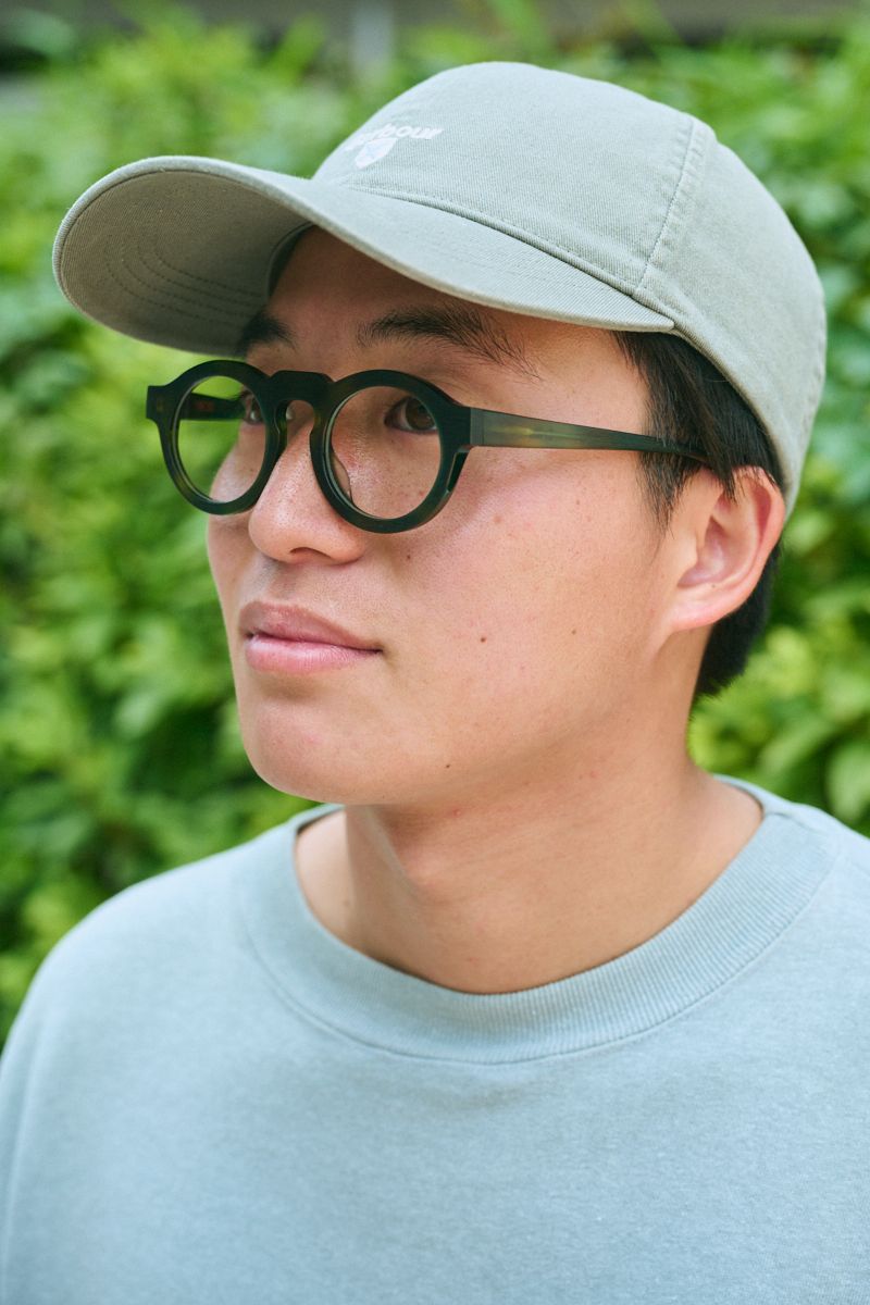 スウェット、パンツ=ともに古着 シューズ=エンダースキーマ 帽子=バブアー 眼鏡=ジャックデュラン バッグ=エンダースキーマ リング=ティファニー