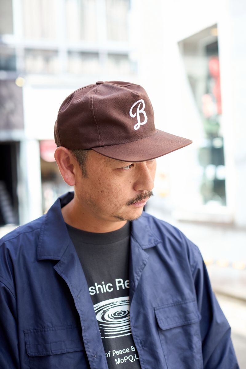 ブラウンのキャップは「ブリックスアンドウッド」からセレクトした。ネイビーの反対色を選ぶことで互いの色を引き立て合い、コーデもさらに立体感を伴うカタチに。ラフながら、確かな計算が垣間見える。