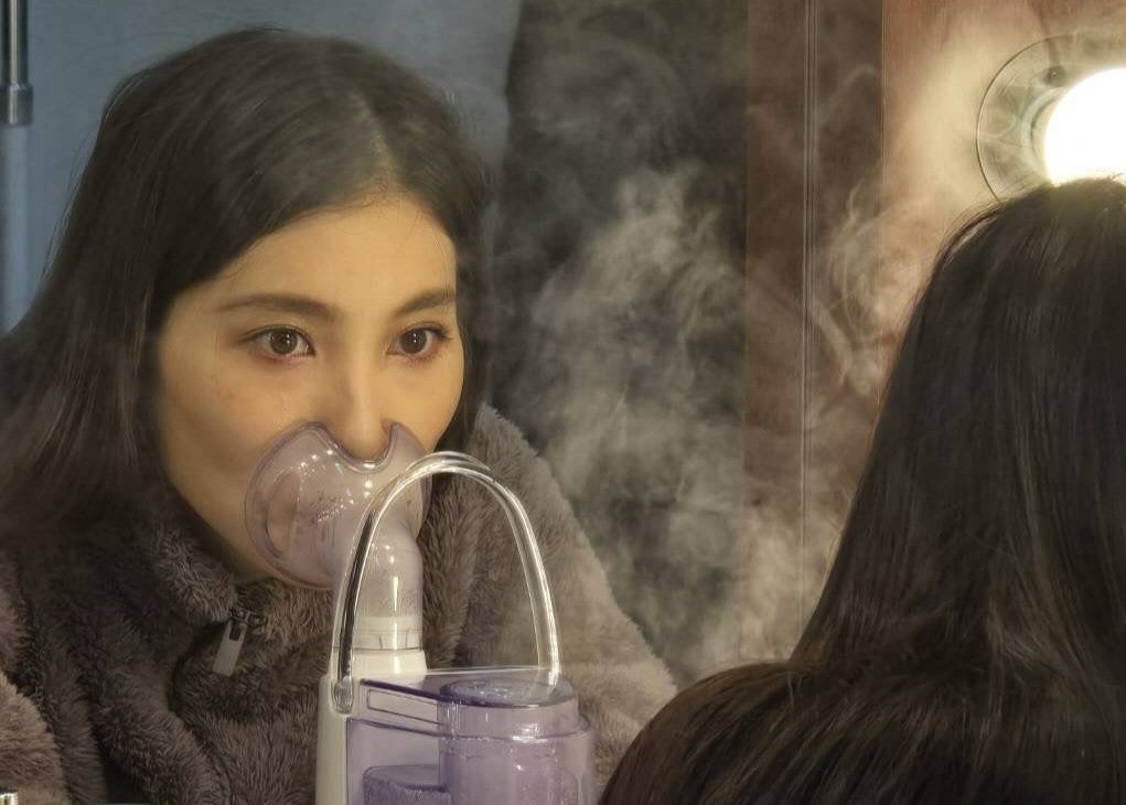 吸入器に顔を当てている写真では、鼻の一部と口が見えないが、それでも流石は女優さんと思わされる程の美貌スタイルである。