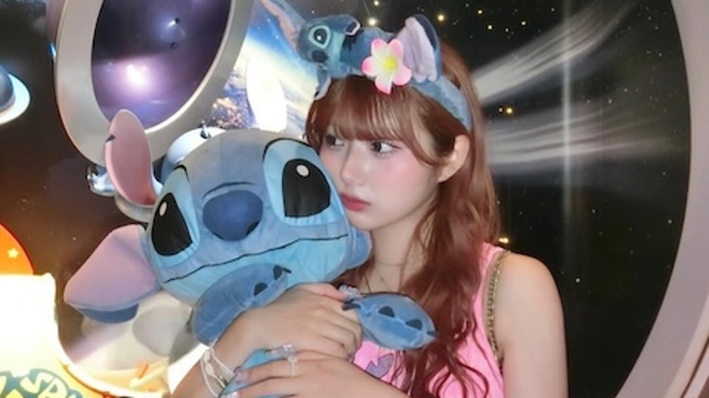 写真には、へそを出したピンクのトップスを着て、スティッチのぬいぐるみを抱く希空の姿が写っている。