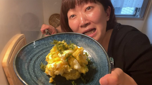 「さつまいもサラダ、ほんと美味しくてもう3回作ってます」と綴り、自身が写った写真1枚をアップ。