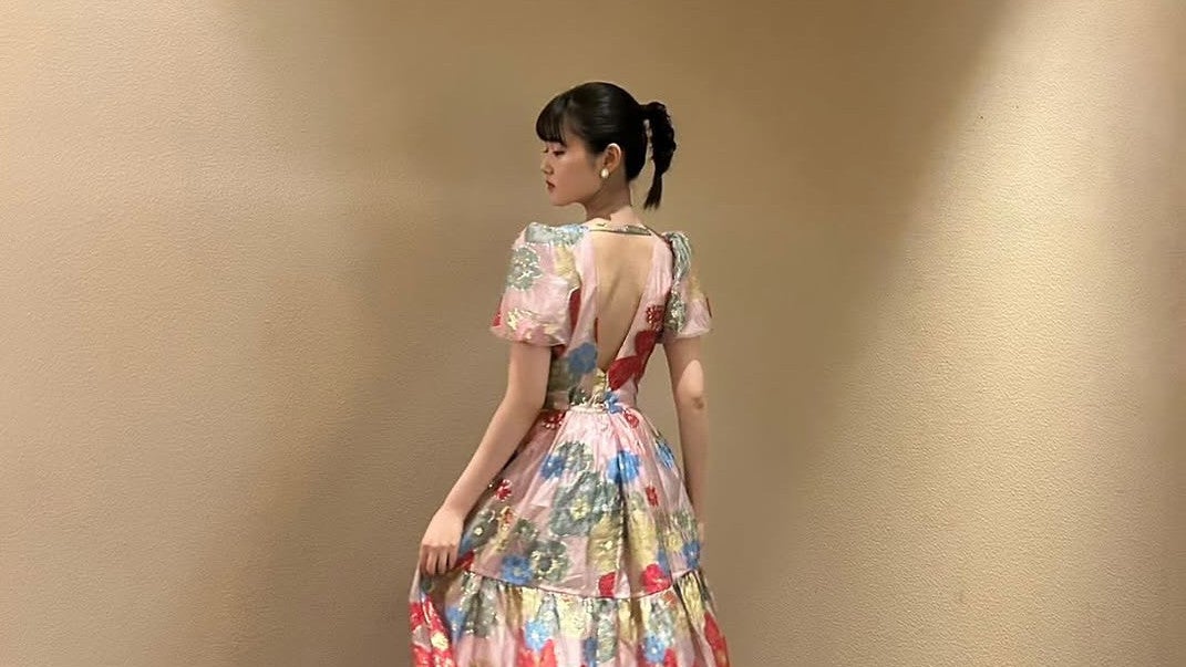 5パターンの衣装を公開した原。大胆なカッティングで美しい背中を披露しているショット、黒のワンピースで大人っぽい雰囲気のショットなどがあり、その魅力にファンからは多くの反応が寄せられている。