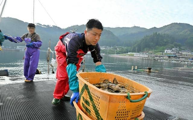 操船するのは父、慎一郎さん(43)。母親の真美子さん(42)も同乗する。数分で、養殖したカキを沈めた場所に到着。ウィンチで引き上げたカゴを、堀内さんは手際よく淡々と開き、中のカキを取り出していった。
