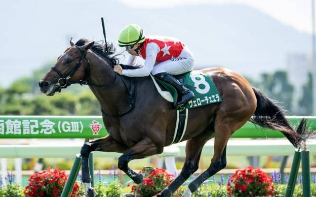 函館競馬場で29日、函館記念(3歳上・GIII・芝2000m)が行われ、中団で脚を溜めた佐々木大輔騎手騎乗の10番人気ヴェローチェエラ(牡4、栗東・須貝尚介厩舎)が3、4コーナーでマクって先頭に立って押し切り、連れて脚を伸ばしたハヤテノフクノスケ(牡4、栗東・中村直也厩舎)に1馬身半差を付けて勝利した。勝ちタイムは1分57秒6(良、レコード)。