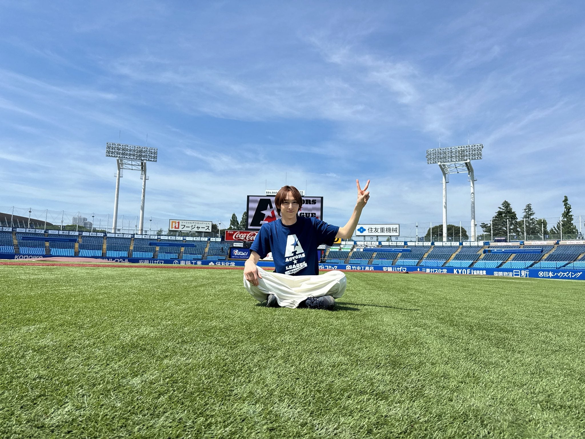 【画像】グラウンドでピースサインを決める田中涼星青空が広がる明治神宮野球場のど真ん中で、田中涼星(@ryousei_ta…