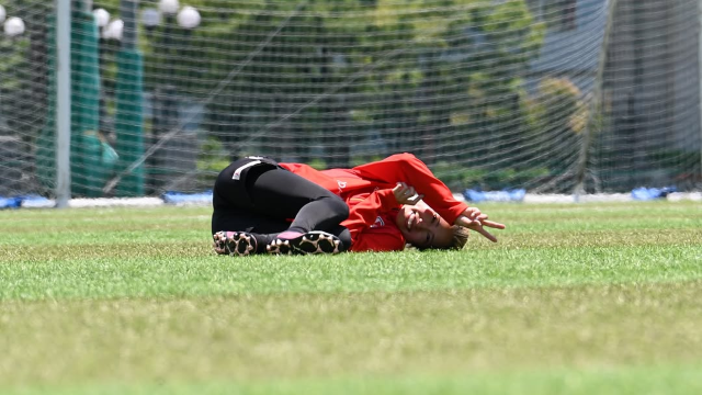 「練習中ではありません。ダウン後疲れすぎてこうなりました。毎日ハードだけど元気にやってます。明日も公開練習なのでぜひ。」と綴り、自身が写った写真数枚をアップ。