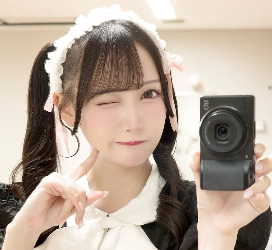 投稿では、メイド服のような衣装を着用した鈴木が、片手にデジカメを持った状態でウインクをする瞬間が写されている。