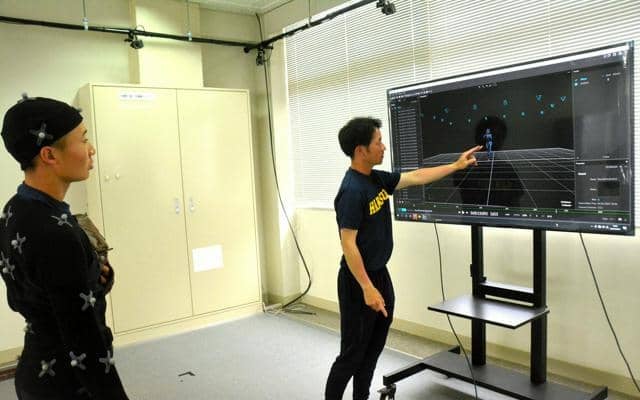 浜田商は4年前、教材として「光学式モーションキャプチャー」を導入した。関節など体の要所につけたマーカーを16台の赤外線カメラで読み取り、体の動きを3次元で映像化する。情報処理科の授業で動画制作などに活用されている。