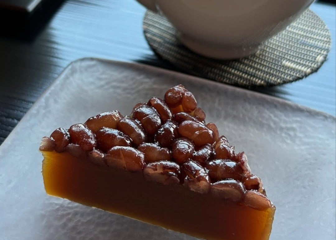 写真に写る和菓子「水無月」は、綺麗に三角形でカットされており、断面の色味も美しく香ばしい匂いと味を想像できる。