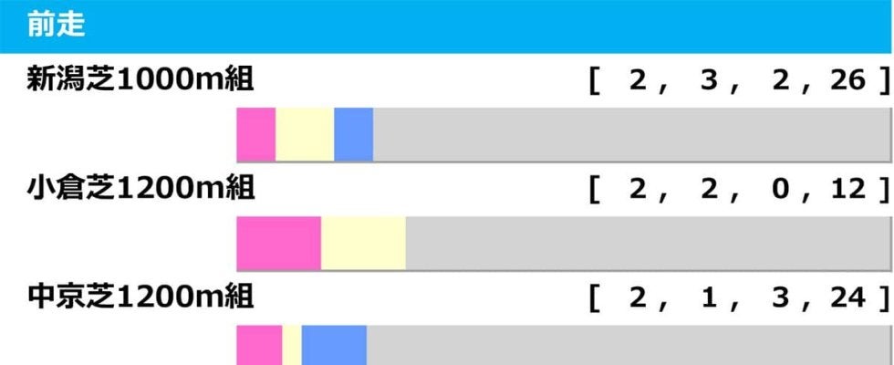 ・新潟芝1000m組【2.3.2.26】 ・小倉芝1200m組【2.2.0.12】 ・中京芝1200m組【2.1.3.24】 ・福島芝1200m組【2.0.3.30】 ・阪神芝1200m組【1.1.1.5】 ・京都芝1200m組【1.1.0.9】 ・中山芝1200m組【0.1.0.6】 ・京都芝1400m組【0.1.0.4】 ・函館芝1200m組【0.0.1.6】