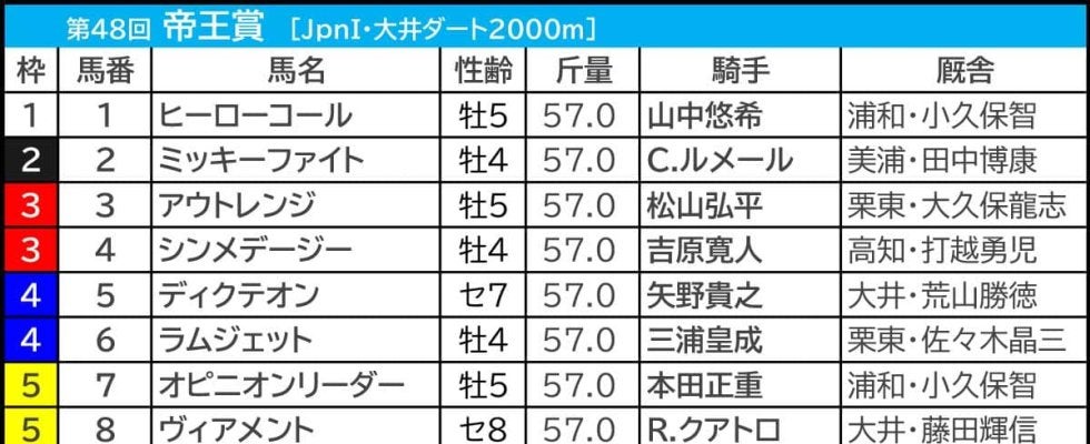 帝王賞3勝目を狙うメイショウハリオは、8歳を迎えた今年、川崎記念を制して約2年ぶりの勝利を飾り、GI級4勝はメンバー最上位の実績を誇る。過去10年、8歳以上の馬は【0.1.1.19】と成績は振わず、近走の成績はムラがあり、アテにしにくい1頭ではあるが、ハマった時の決め手は他馬を凌駕するものがあり、切りにくい馬ではある。