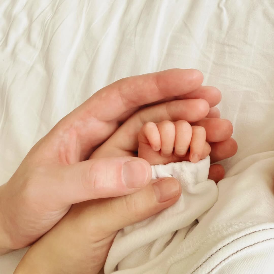 投稿には赤ちゃんの小さな手を優しく包む親子の手の写真が添えられ、あふれる愛情が画面越しにも伝わってくる一枚となっている。