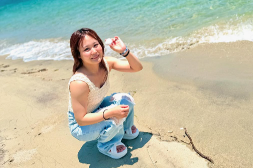 砂浜でのリラックスしたビーチSHOTには、白ノースリーブにダメージデニムという私服スタイルでのんびりした雰囲気が漂っており、海辺のロケーションが旅行気分を引き立てている。